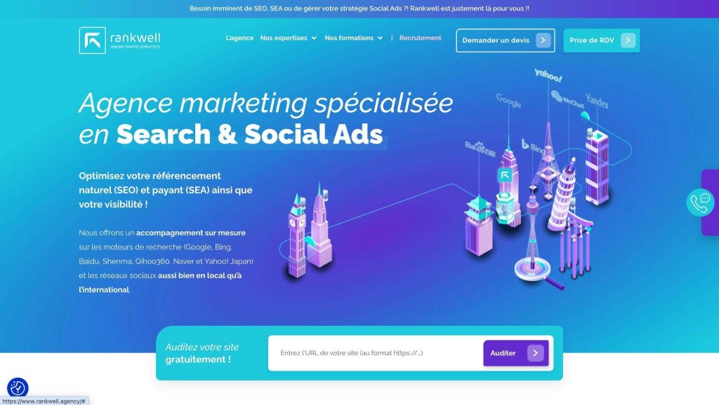 Spécialisée dans le SEO international, le SEA et l’IA, cette agence Search Marketing a été fondée en 2017 par Benjamin Thabaut. RANKWELL, basée à Paris, accompagne des clients internationaux emblématiques comme Qatar Aieways, Hermes, Winamax, Les Furets, Loreal, CertiDeal.